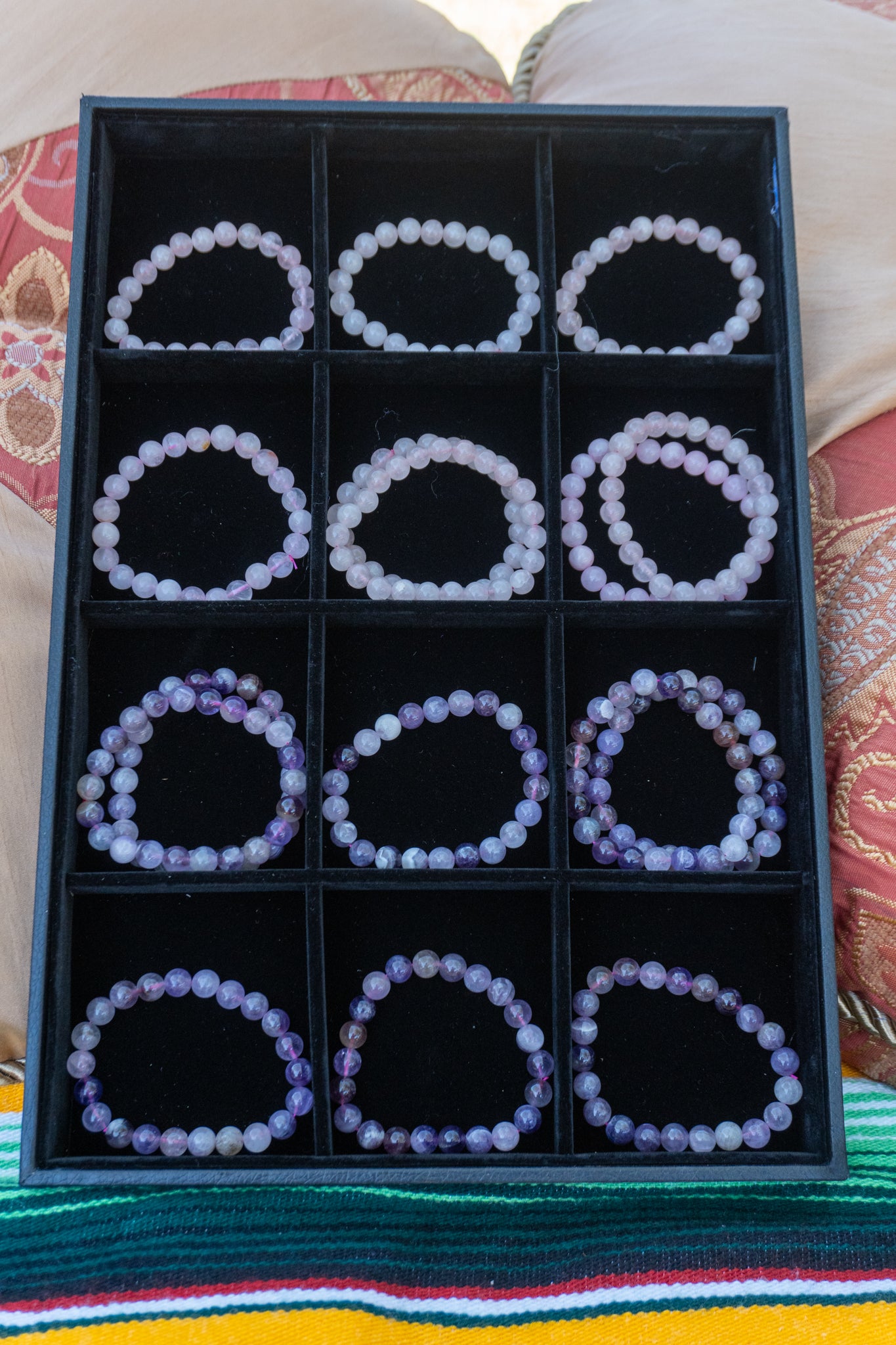 Each bracelet features polished amethyst beads known for their calming properties. Embrace tranquility and elevate your look with this versatile accessory. Perfect for yourself or as a thoughtful gift.